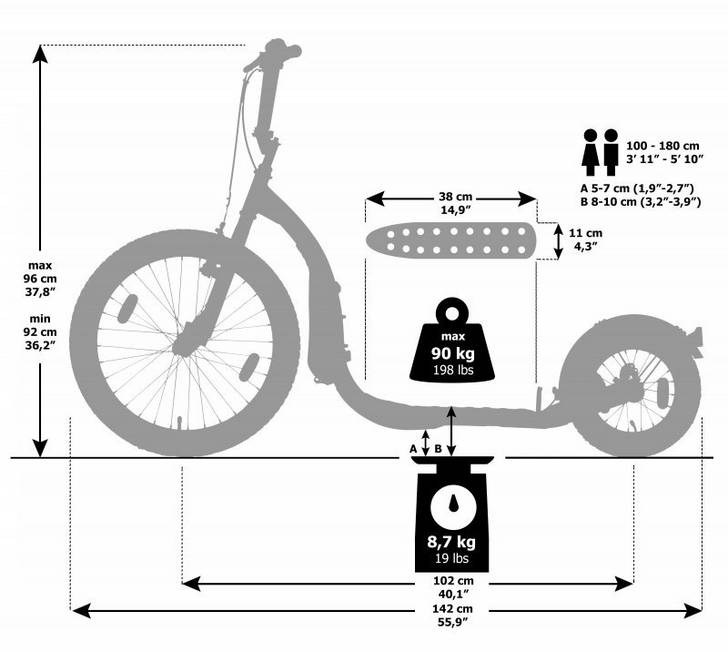 FAT MAX is the SUV of scooters: a dictator in downhill rides, but still light enough for off-road riding. The fixed fork, FAT wheels, a wide footboard and hydraulic brakes guarantee a comfortable and safe ride that also allows you to unleash your imagination.