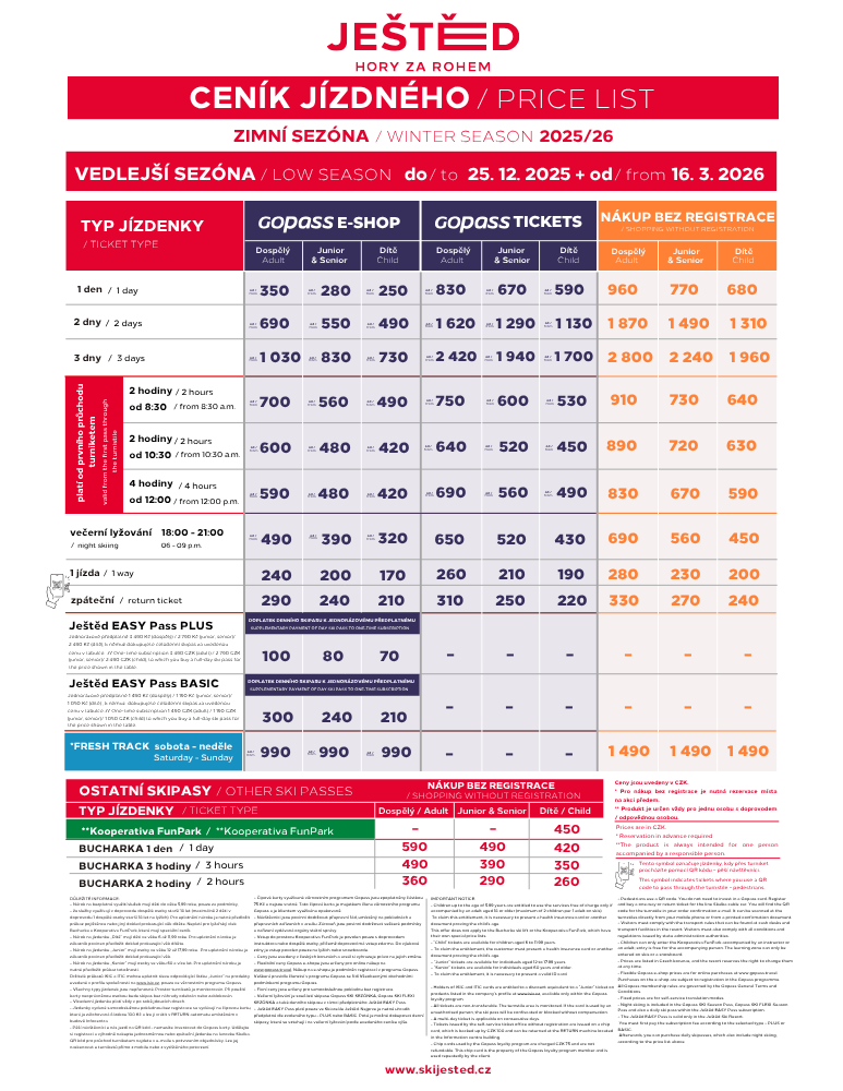 Skipasy i vrácenou hotovost si zkontrolujte ihned u pokladny. Na pozdější reklamace nebude brán zřetel. Skipasy jsou nepřenosné, proto nesmí být půjčovány ani přeprodávány. Pokladny a odbavovací systémy jsou monitorovány kamerou. Při použití karty neoprávněnou osobou bude skipas bez náhrady odebrán nebo zablokován. Prostor turniketů je monitorován. Při průchodu turniketem je pořízena fotografie, která je zpracována a uchována odbavovacím systémem. Uchování tohoto osobního údaje - fotografie trvá po dobu platnosti skipasu, poté je systémem vymazán. Provozovatel si vyhrazuje právo změny cen. Všechny uvedené ceny jsou v Kč.